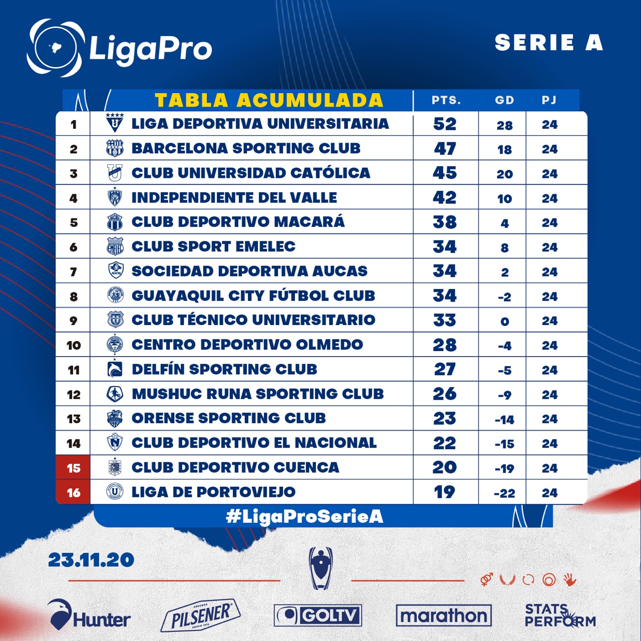 Web Por mifutbolecuador el 20 febrero 2022 32 Selecciona la tabla que quieres revisar. Web Tabla de posiciones del campeonato ecuatoriano de fútbol Serie A 2023 Copa Ecuador sigue los partidos en vivo Tabla de posiciones del campeonato ecuatoriano de fútbol. Web Partidos resultados y tabla de posiciones Jugadores y Cuerpo Técnico Futsal Futsal Femenino Partidos resultados y tabla de posiciones Jugadores y Cuerpo Técnico.